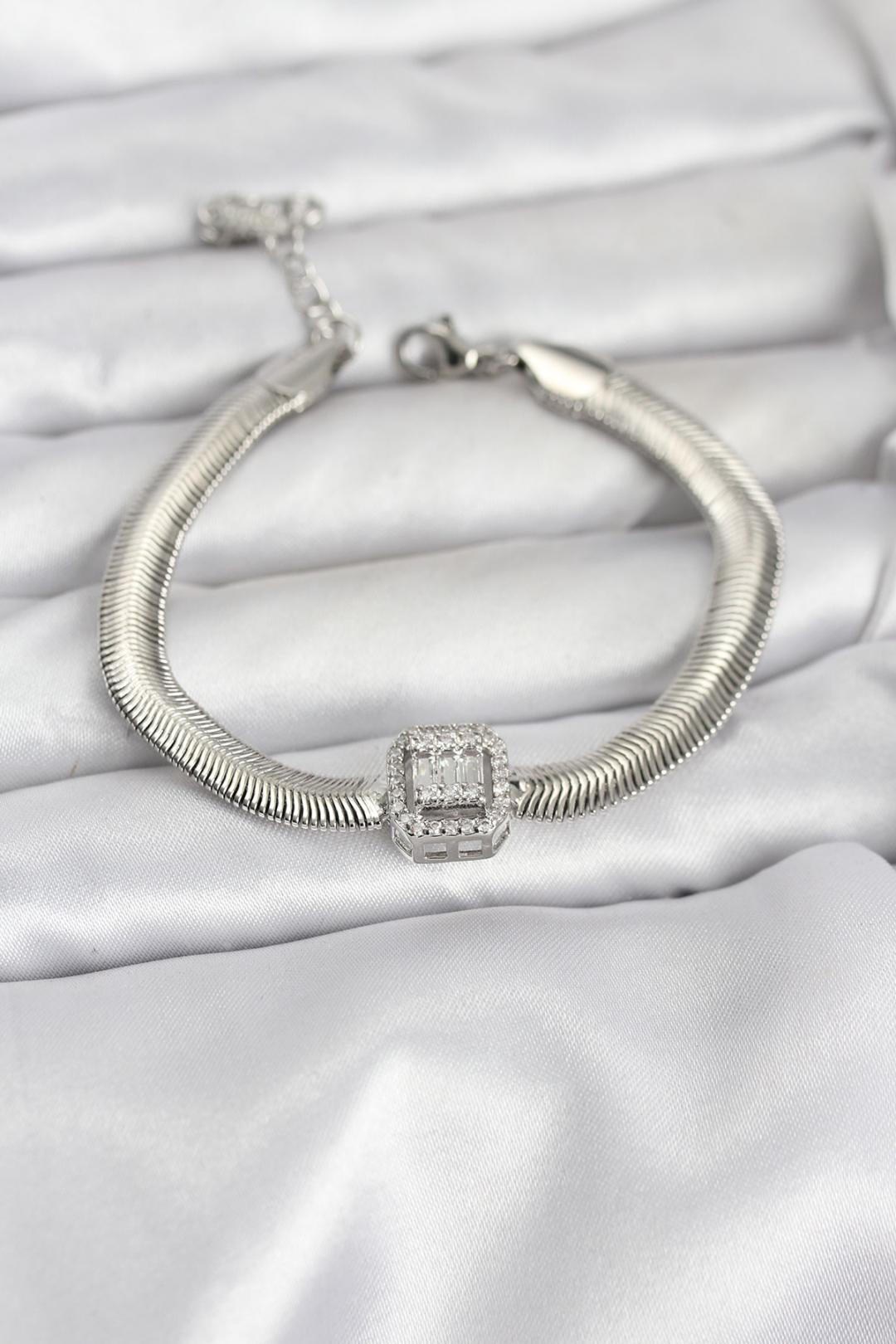 316L Çelik Gümüş Renk Baget Zirkon Taşlı Yılan Zincirli Kadın Bileklik