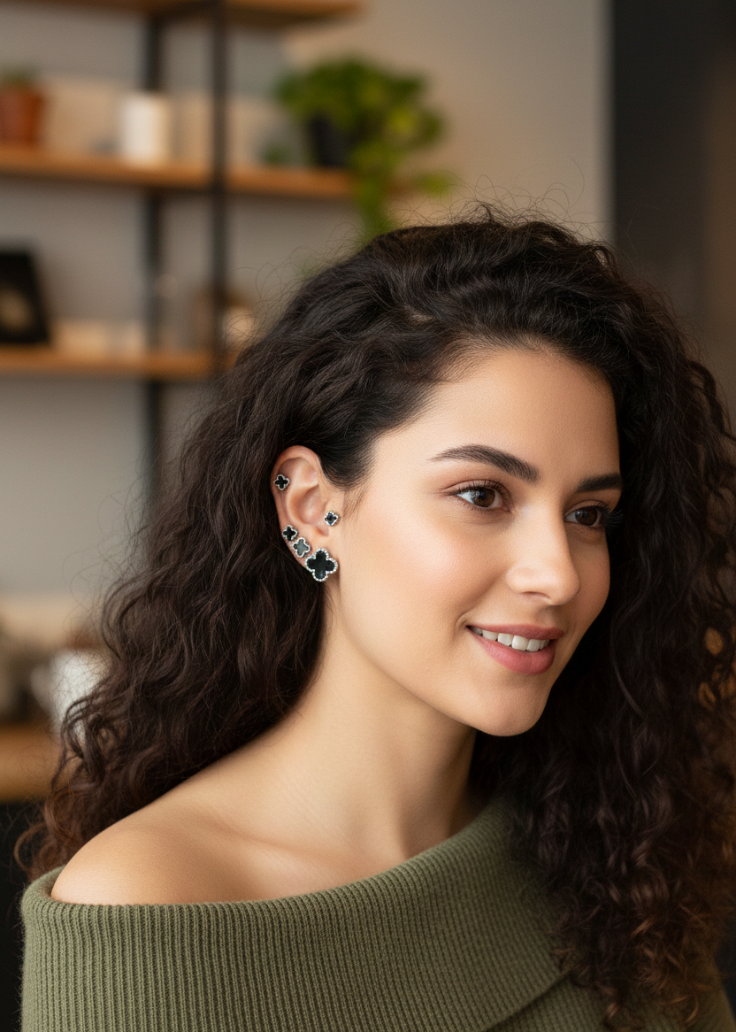 316L Çelik Gümüş Siyah Renk 3 Boy Yonca Küpe Seti