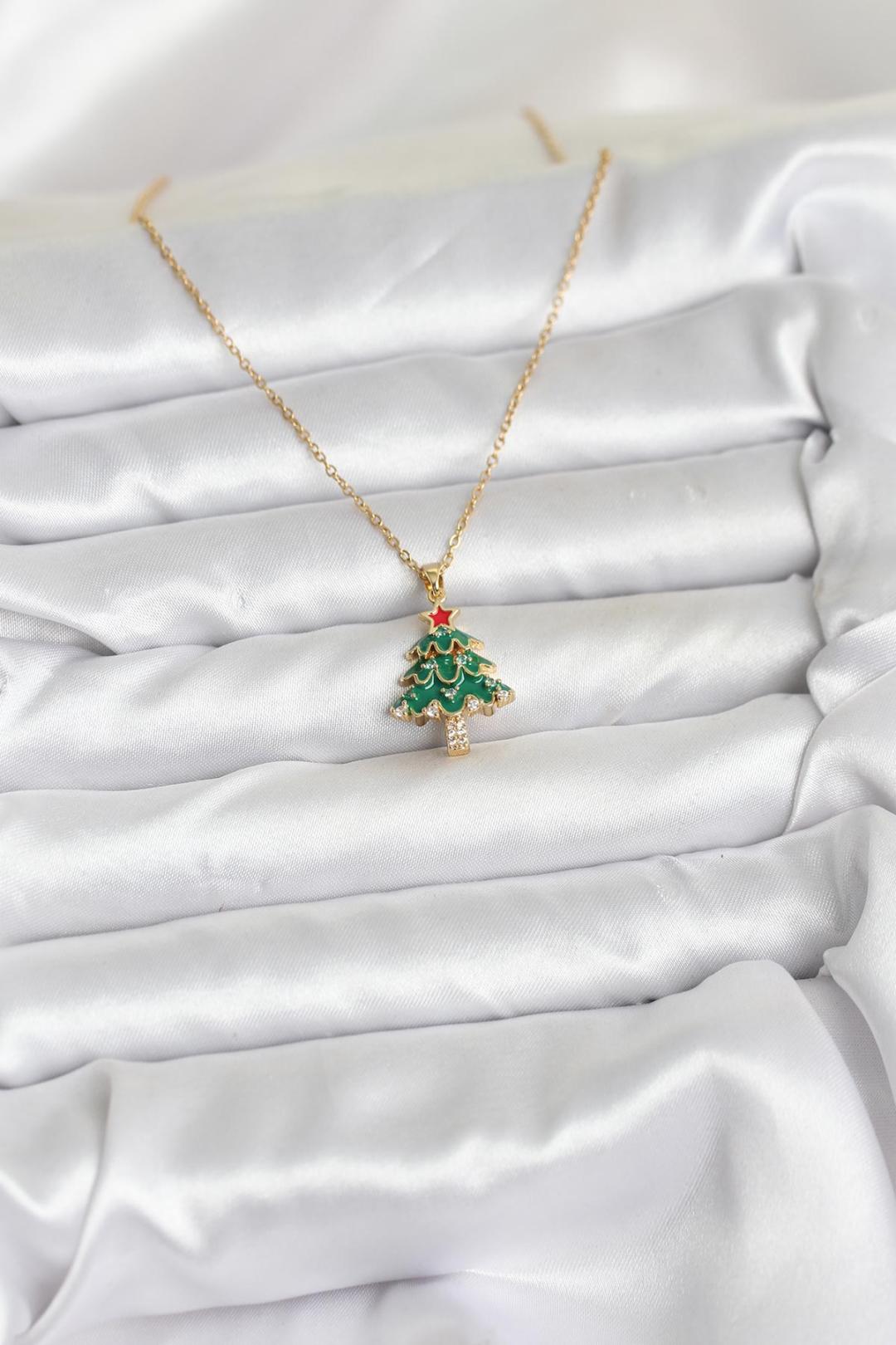 316L Çelik Zincir Gold Renk Çam Ağacı Model Yılbaşı Temalı Kadın Kolye