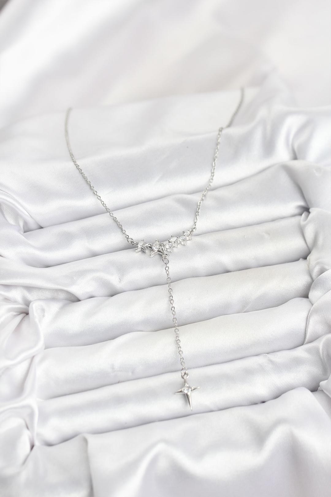 Gümüş rengin cool parlaklığıyla yıldız figürünün şık enerjisini bir araya getiren bu Y model kolye, boyun hattını zarif şekilde vurgulayan modern bir tasarımdır.
