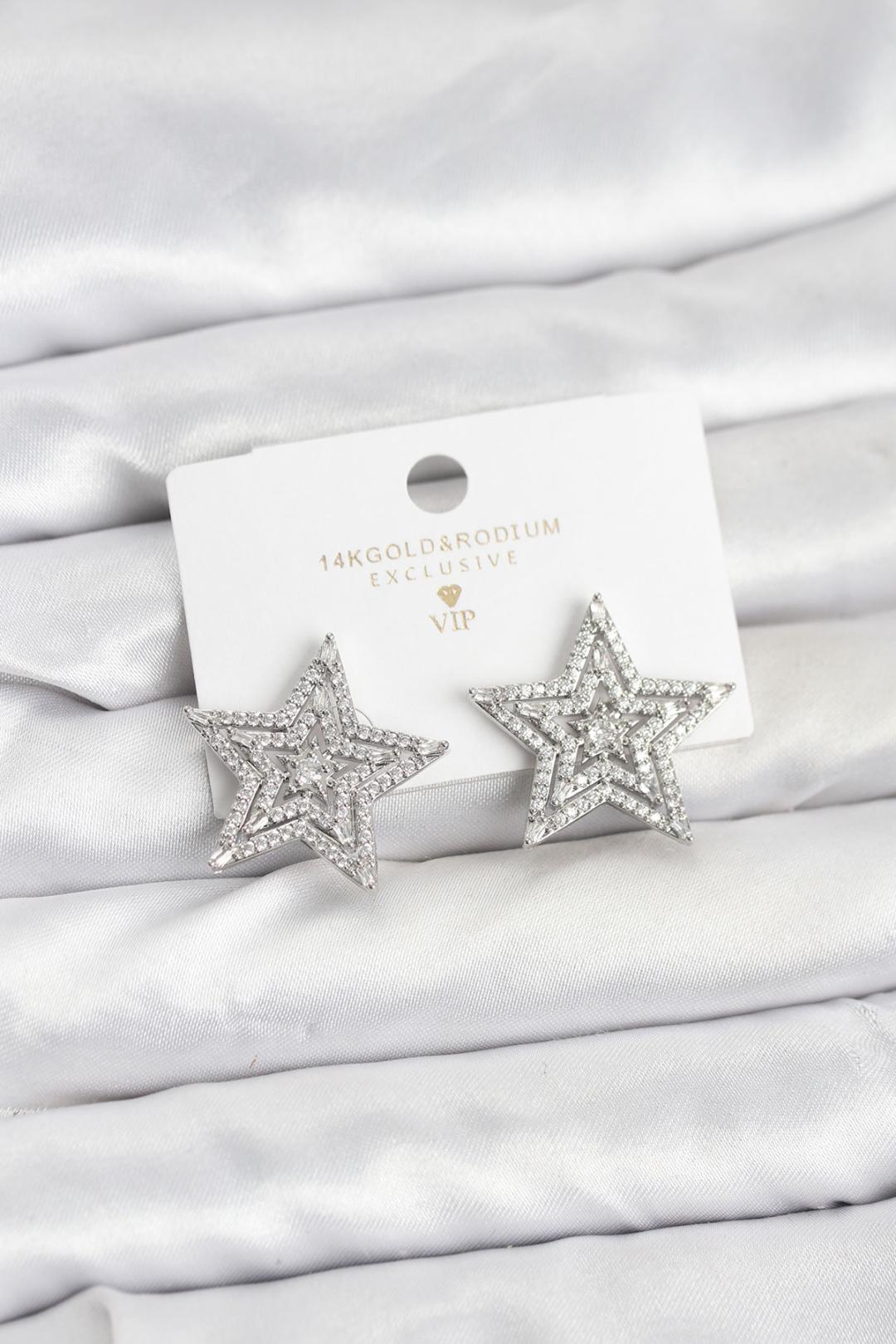 Gümüş Renk Pirinç Zirkon Taşlı Yıldız Model Kadın Küpe
