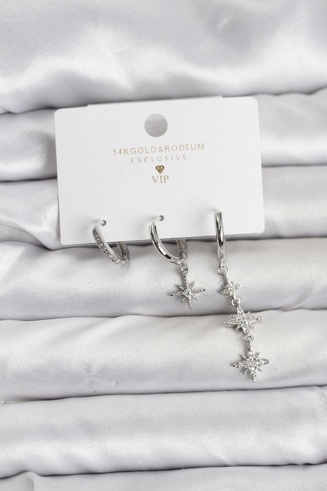 Kutup Yıldızı Model Gümüş Renk Pirinç 3'lü Kadın Küpe Seti – Modern ve Işıltılı Zarafet