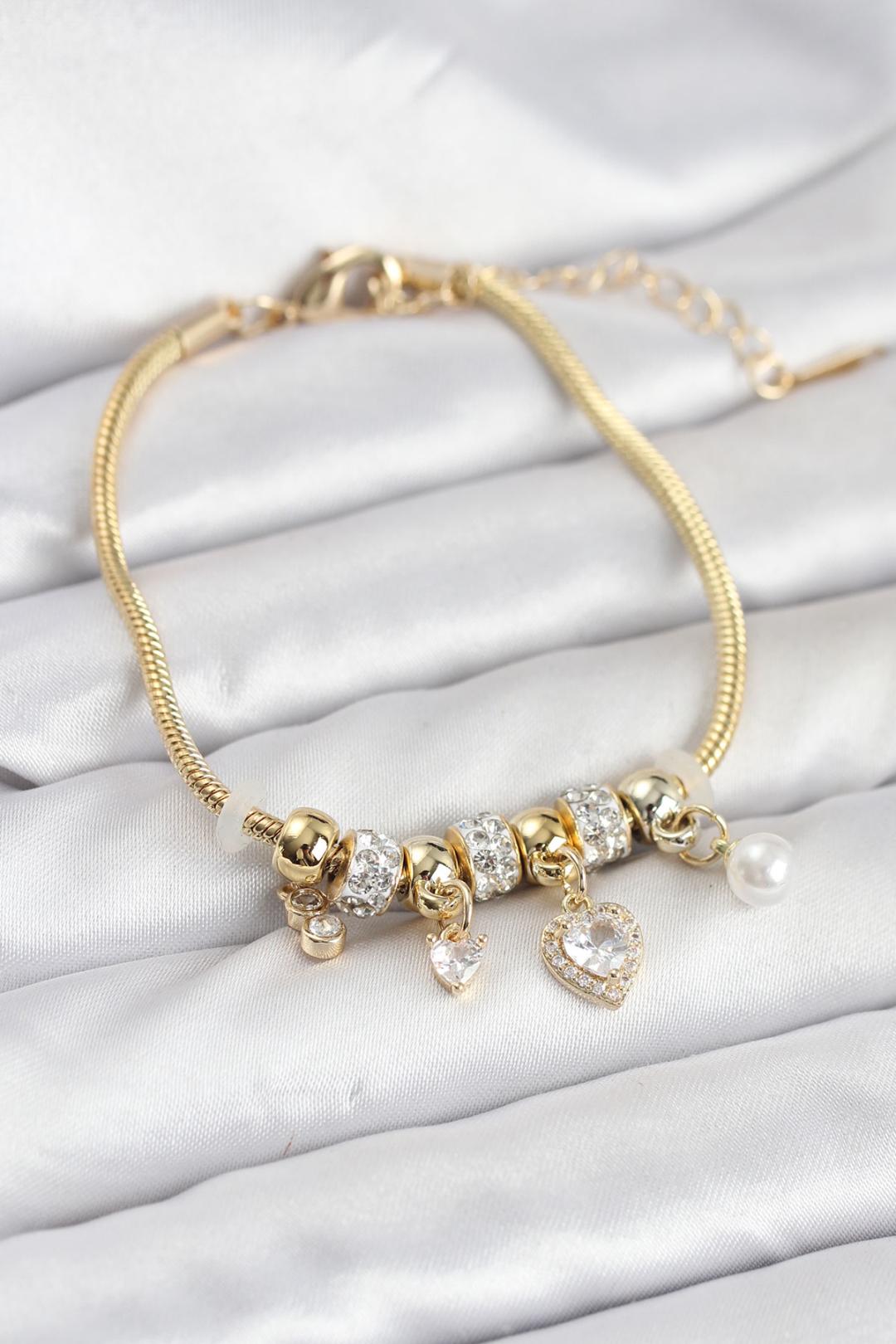 Pirinç Gold Renk Kalp Charmlı Kadın Bileklik