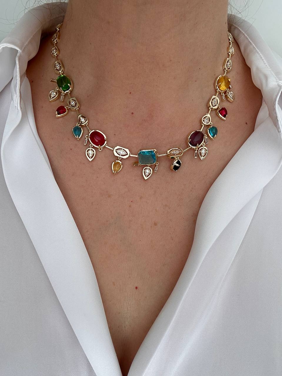 Pirinç gold kaplama ve renkli zirkon taşlarıyla tasarlanan bu kolye, zarif ve dikkat çekici görünümüyle her stile uyum sağlar. Şıklığınıza ışıltı katmak için mükemmel bir seçim. ✨