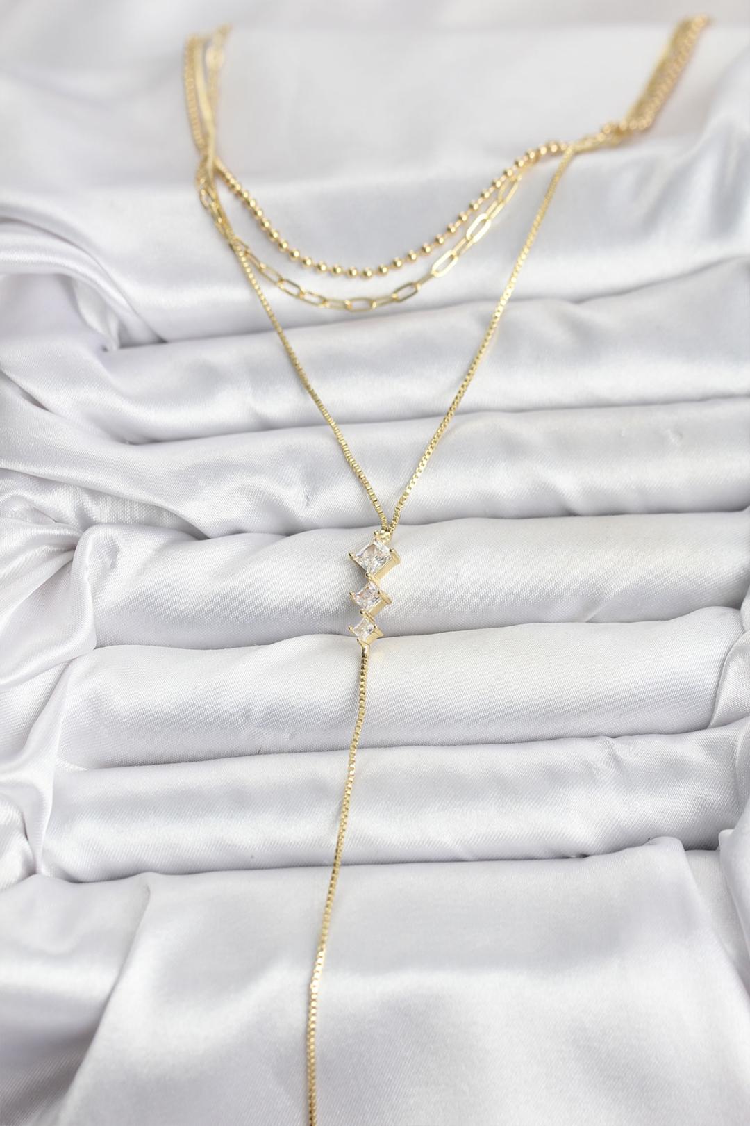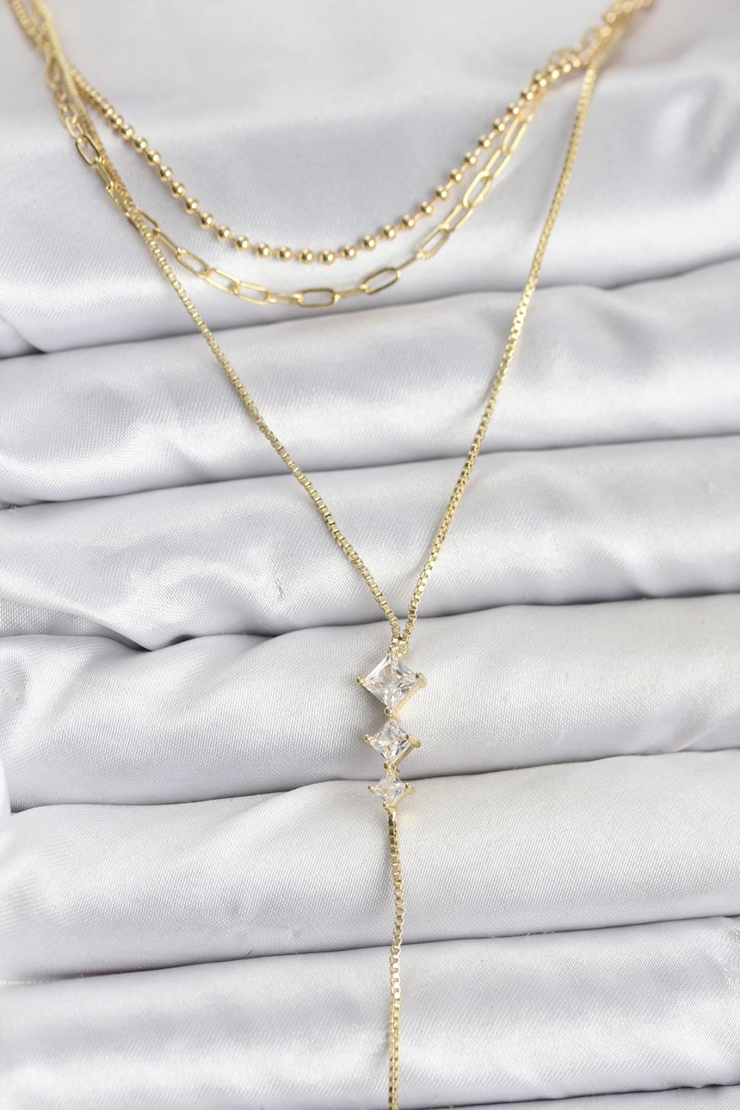 Pirinç Gold Renk Zirkon Taş Detaylı 3'lü Kombin Y Kadın Kolye