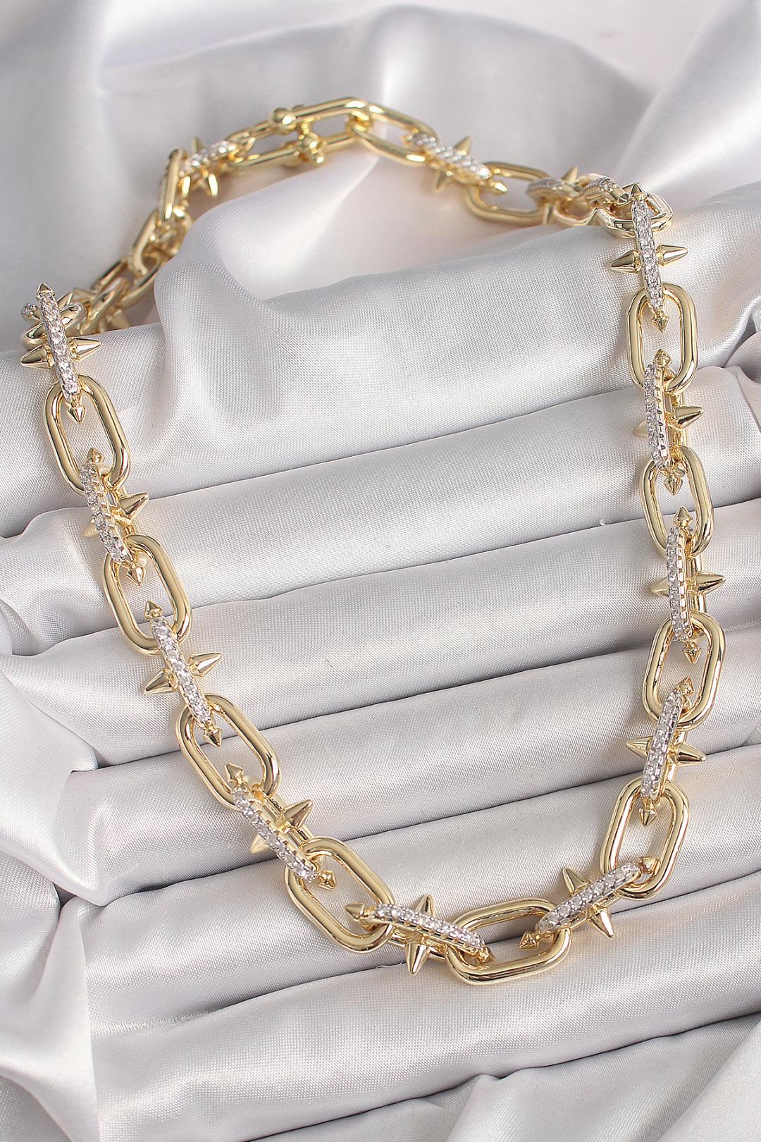 Pirinç Gold Renk Zirkon Taşlı Dikenli Halka Model VIP Exclusive Seri Kadın Kolye – Cesur ve Işıltılı Bir Stil